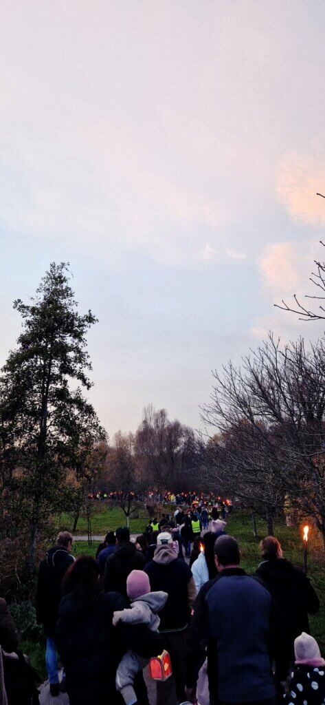 Die Kindertagesstätte Arche Noah wagte in diesem Jahr eine neue Form des Martinsfestes. Erstmalig trafen sich die Familien bereits um 16:30 Uhr am Minigolfplatz, um das Fest in einem geänderten Rahmen zu erleben. Nach einer herzlichen Begrüßung startete der Umzug früher als gewohnt und führte bei milden Temperaturen durch das stimmungsvolle Landschaftsschutzgebiet „Im Gründlein“. Voller Stolz trugen die Kinder ihre farbenfrohen Laternen, begleitet von Erwachsenen mit Fackeln, sodass sich der Lichterzug in eindrucksvoller Weise durch die romantische Herbstlandschaft schlängelte.